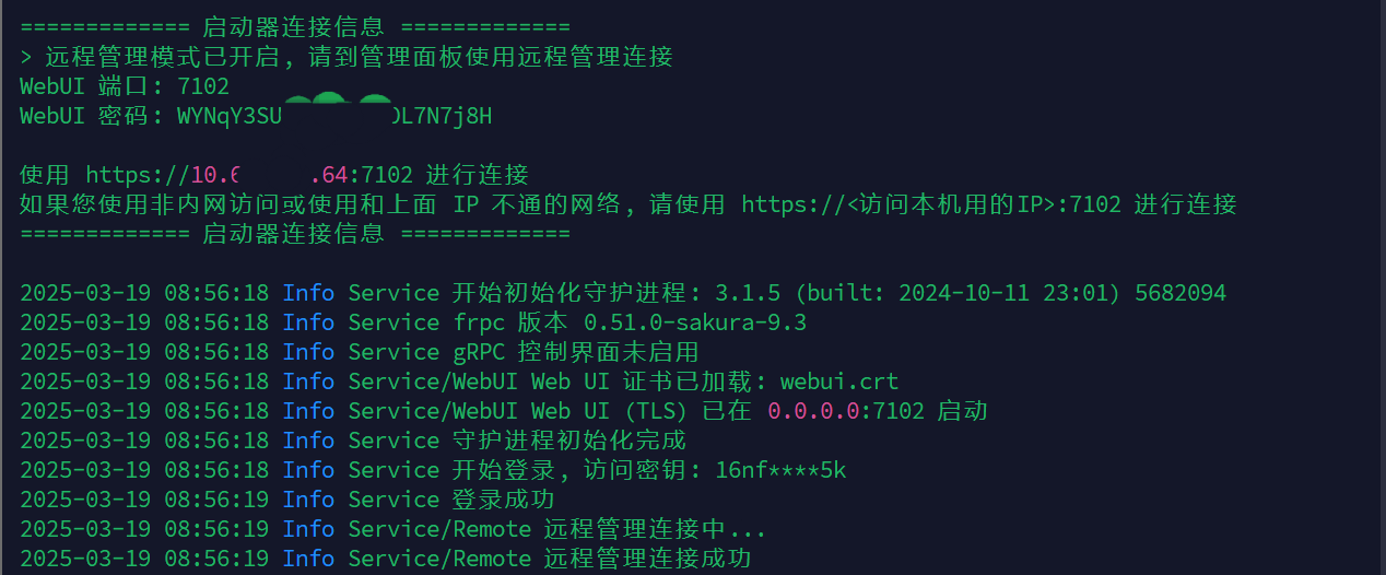 如图的红色字符的链接,就是WebUI和Minecraft的远程访问链接,将Minecraft对应的复制到游戏中即可连接上