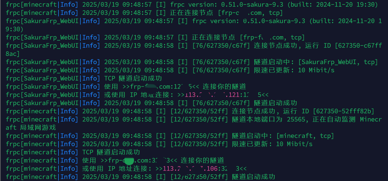 安装好后,应该是会自动输出日志,并需要填写访问密钥,这个(或者说接下来的操作)可以在SakuraFrp官网的管理面板找到