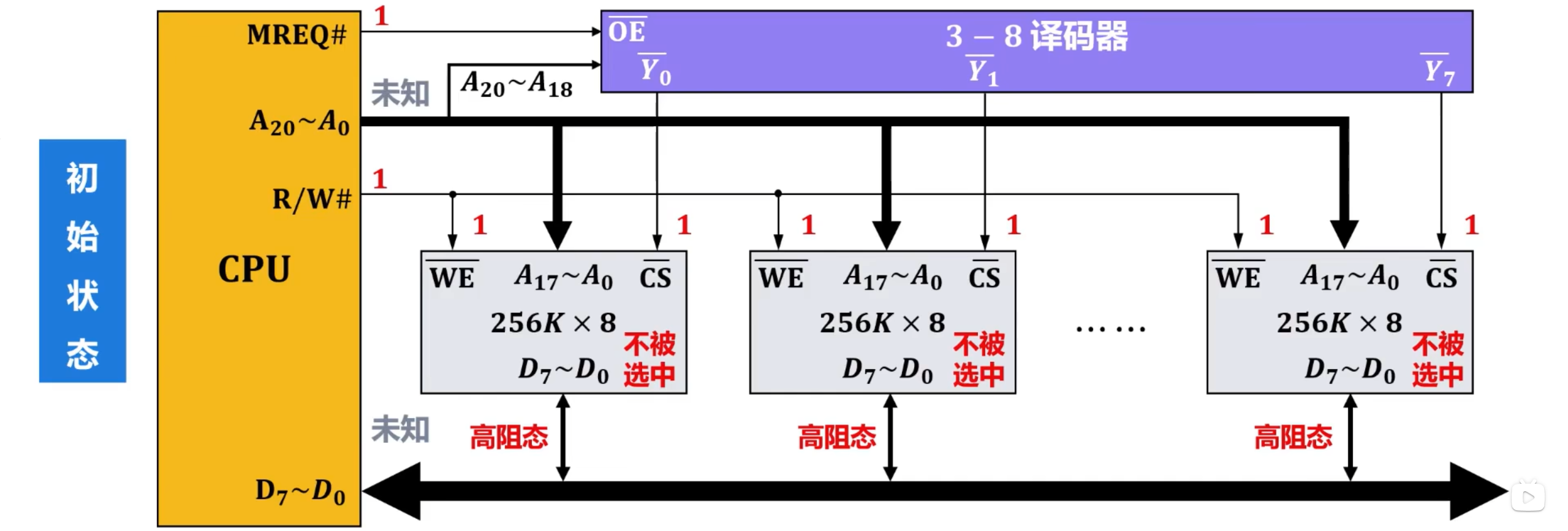 - 缺点:系统工作效率较低(三条总线只能同时工作一条)。
