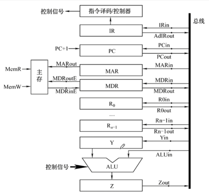 单总线结构:CPU、主存、I/O设备(通过I/O接口)都连接在一组总线上,允许I/O设备之间、I/O设备和CPU之间或I/O设备与主存之间直接交换信息。
