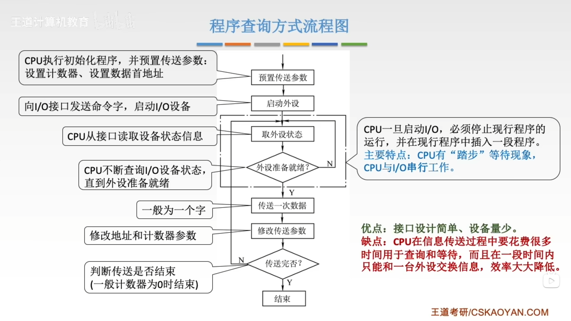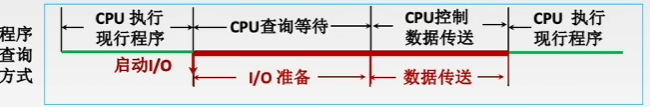 - 定时查询:在保证数据不丢失的情况下,每隔一段时间CPU就查询一次I/O状态,查询的间隔内CPU可以执行其它程序