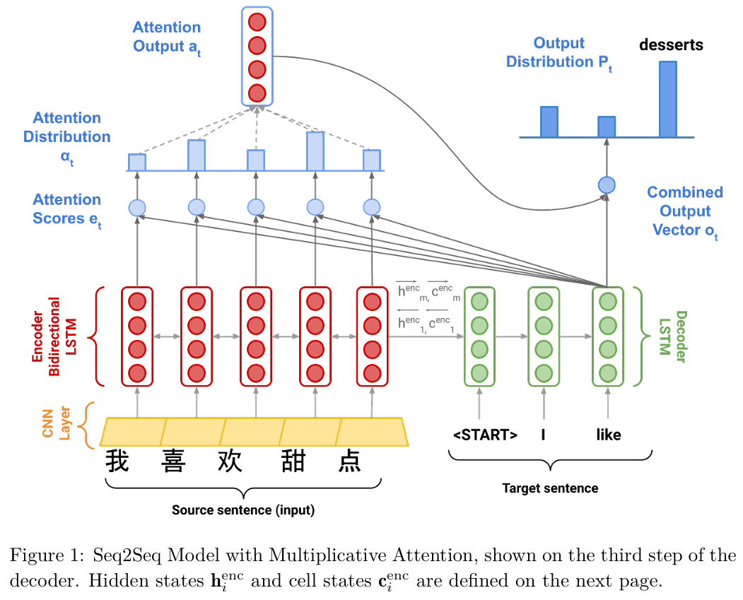 We then use $\mathbf{h}_t^{\text{dec}}$ to compute multiplicative attention over $\mathbf{h}_1^{\text{enc}}, \dots, \mathbf{h}m^{\text{enc}}$: $$ \mathbf{e}_{t,i} = (\mathbf{h}_t^{\text{dec}})^T \mathbf{W}_{\text{attProj}} \mathbf{h}_i^{\text{enc}} \quad \text{where} \quad \mathbf{e}_t \in \mathbb{R}^{m \times 1}, \mathbf{W}_{\text{attProj}} \in \mathbb{R}^{h \times 2h} \quad 1 \leq i \leq m \quad (6) $$ $\mathbf{e}{t,i}$ is a scalar, the $i$ th element of $\mathbf{e}_t \in \mathbb{R}^{m \times 1}$, computed using the hidden state of the decoder at the $t$ th step, $\mathbf{h}t^{\text{dec}} \in \mathbb{R}^{h \times 1}$, the attention projection $\mathbf{W}{\text{attProj}} \in \mathbb{R}^{h \times 2h}$, and the hidden state of the encoder at the $i$ th step, $\mathbf{h}_i^{\text{enc}} \in \mathbb{R}^{2h \times 1}$.
