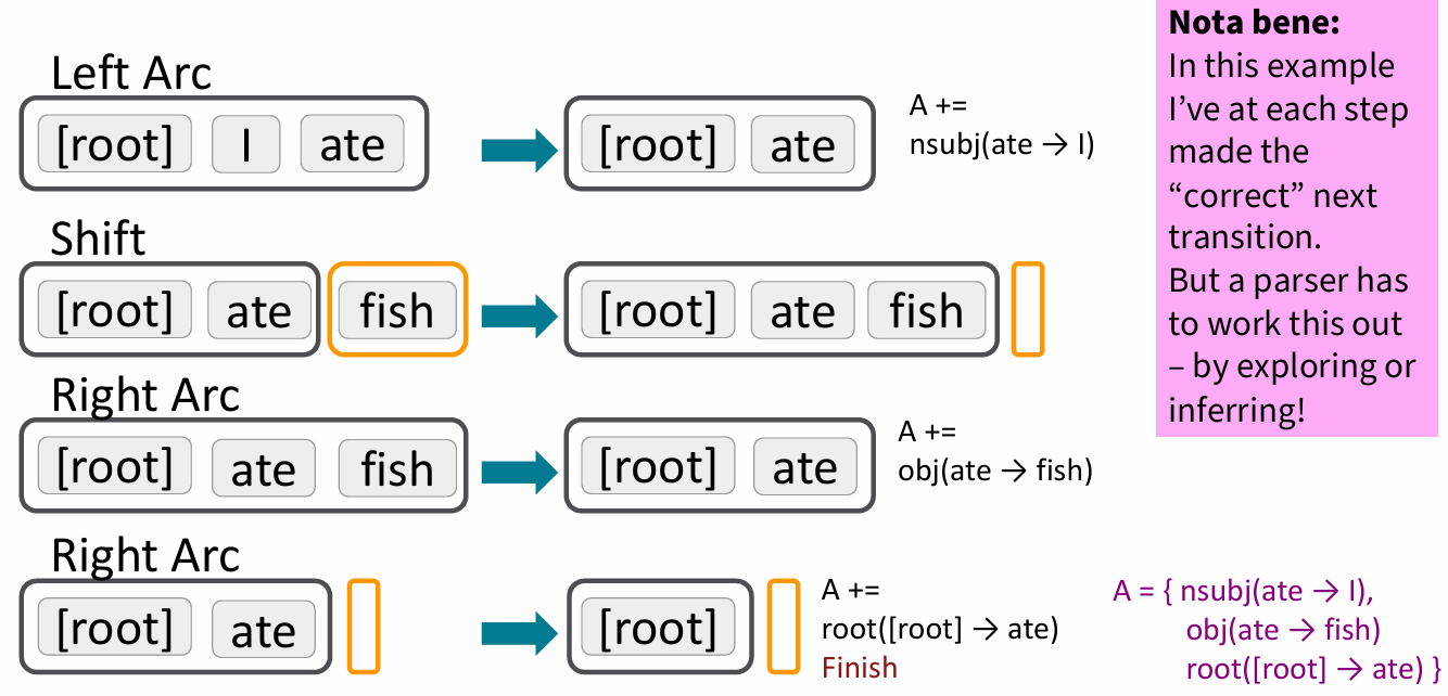 ate“是中心词,"fish“依存于”ate“的关系。然后将”fish“移出栈。 - 最后的Right Arc操作 使”